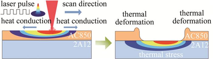 熱應(yīng)力耦合分析可以反映熱溫度場和應(yīng)力場的相互影響過程,根據(jù)求解步驟的不同, 分為直接求解法和間接求解法。直接求解法是利用包含溫度以及位移自由度的耦合單元,經(jīng)過一次求解計算同時得到熱分析和結(jié)構(gòu)應(yīng)力分析結(jié)果。間接求解法則需要分步進行,首先通過熱分析計算出模型的節(jié)點溫度,將求解的節(jié)點溫度作為體載荷施加到結(jié)構(gòu)應(yīng)力分析中,求解出節(jié)點應(yīng)力。由于直接求解法的平衡狀態(tài)需要同時滿足多個準(zhǔn)則,復(fù)雜的約束條件使得節(jié)點自由度較多,并且矩陣方程繁雜,求解效率低。在鋁合金化銑保護膠激光刻型熱應(yīng)力耦合分析中,相較于結(jié)構(gòu)響應(yīng),熱分析的溫度對結(jié)構(gòu)分析時應(yīng)力應(yīng)變的影響更為顯著,因此本文中選擇效率較高的間接求解法來實現(xiàn)對鋁合金化銑保護膠激光刻型的熱應(yīng)力耦合分析。脈沖激光的刻蝕原理如圖 1所示,采用移動高斯熱源模擬長脈沖激光與目標(biāo)材料的相互作用過程。