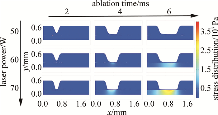 縱向觀察發(fā)現(xiàn),燒蝕時間恒定,燒蝕深度隨著激光功率的增大逐漸增大,同時,燒蝕區(qū)域底部對應(yīng)的保護膠與鋁合金的結(jié)合界面處出現(xiàn)了應(yīng)力集中現(xiàn)象,而應(yīng)力集中點也隨著激光功率的增大而顯著增多;其中燒蝕時間為4 ms、6 ms,激光功率為60 W、70 W時,保護膠與鋁合金的結(jié)合界面處開始出現(xiàn)應(yīng)力集中現(xiàn)象,且應(yīng)力集中區(qū)隨著激光掃描路徑延伸逐漸擴大,應(yīng)力至高點出現(xiàn)在掃描區(qū)域的中心位置,且對鋁合金基體材料產(chǎn)生了應(yīng)力影響。橫向觀察發(fā)現(xiàn),激光功率為50 W時,整個燒蝕過程中沒有出現(xiàn)特別明顯的應(yīng)力集中區(qū),這是因為激光功率較小時,保護膠材料不能被完全燒蝕,所以保護膠與鋁合金的結(jié)合界面處并未產(chǎn)生明顯應(yīng)力;同燒蝕深度的變化規(guī)律,其應(yīng)力影響區(qū)域面積與應(yīng)力數(shù)值也隨著激光功率的增大而增大。仿真計算結(jié)果表明:激光功率越大,燒蝕深度越深;激光焦點距保護膠與鋁合金的結(jié)合界面處越近,界面處產(chǎn)生的應(yīng)力就越大,由于鋁合金是熱的良導(dǎo)體,較高的傳熱性能使其在激光刻型時,容易產(chǎn)生更大范圍的應(yīng)力區(qū)域與更高的應(yīng)力值。