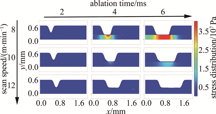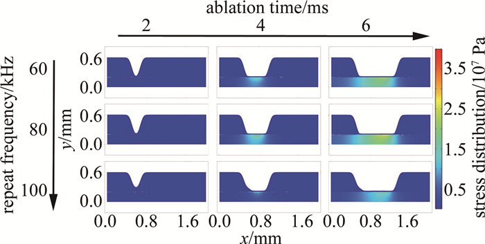 圖 3是以激光掃描速率為變量的仿真結(jié)果。分別選取8 m/min, 10 m/min, 12 m/min為參數(shù)節(jié)點,其余仿真條件如下:激光功率為60 W、重復(fù)頻率為100 kHz。燒蝕時間節(jié)點選擇與圖例設(shè)置同圖 2。橫向觀察發(fā)現(xiàn),較10 m/min, 12 m/min的仿真結(jié)果,激光掃描速率為8 m/min時,其燒蝕深度較深,且整個燒蝕過程中產(chǎn)生的應(yīng)力區(qū)域較大、應(yīng)力值較高,而燒蝕深度、應(yīng)力區(qū)域和應(yīng)力極值均與掃描速率呈負相關(guān)。因為掃描速率的增大會造成激光燒蝕過程中脈沖重疊率的減小,從而降低了激光加工過程中的熱效應(yīng)累積,同時也減少了熱應(yīng)力的集中現(xiàn)象。