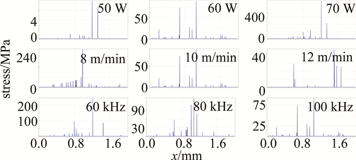 (2) 應(yīng)力極值與激光功率呈正相關(guān),與掃描速率和重復(fù)頻率呈負相關(guān),其中激光功率對應(yīng)力極值的影響較為顯著。由于鋁合金是熱的良導(dǎo)體,較高的傳熱性能使其在激光刻型時,更易產(chǎn)生大范圍的應(yīng)力區(qū)域與更高的應(yīng)力值。
