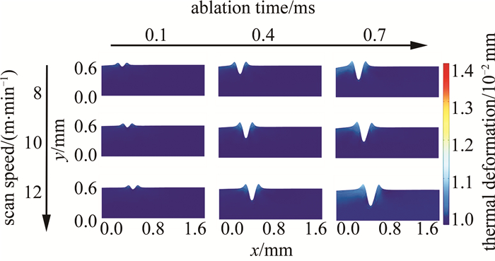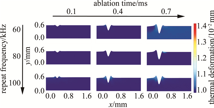 圖 8是以重復(fù)頻率為變量的仿真結(jié)果。分別選取60 kHz、80 kHz、100 kHz為參數(shù)節(jié)點, 其余仿真條件如下:激光功率為60 W、掃描速率為10 m/min。燒蝕時間節(jié)點選擇與圖例設(shè)置同圖 6。觀察圖 8發(fā)現(xiàn),掃描時間恒定時,重復(fù)頻率以選取的參數(shù)節(jié)點變化; 重復(fù)頻率為60 kHz、80 kHz時,切口形貌、燒蝕深度無明顯變化,當(dāng)重復(fù)頻率達到100 kHz時,形貌變化較明顯,且切口處產(chǎn)生了較大的熱變形現(xiàn)象。